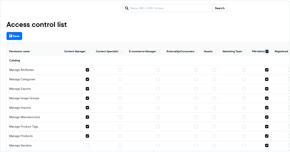 The Access Control List allows you to control access to specific system features and configuration sections in KatanaPIM. While Permission Rules define what a role can do within entities (like Products or Categories), the Access Control List determines access to system-level functionality and menu items.